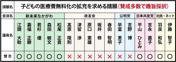 「子どもの医療費無料化の拡充を求める請願書」の内容は、中学校卒まで医療費無料化を求めるものでした。