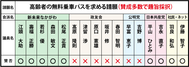 「高齢者の無料乗車パスを求める請願書」の内容は、まずその様な事を検討できる制度の創設と高齢者に無料パスを支給し出かける機会を増やし健康でいて欲しいとの趣旨が含まれておりました。