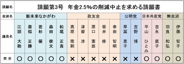 請願第3号「年金2.5%の削減中止を求める請願書」が提出され私が所属する会派「新未来なかがわ」は賛成しました。