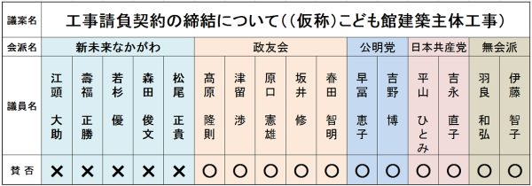 議案第94号工事請負契約の締結について((仮称)こども館 建築主体工事)の採決にて、「新未来なかがわ」会派所属議員5名のみ反対としました。